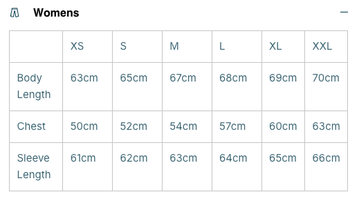 Note: Chest measurements in the chart below are taken across the front of the chest/jacket and not around the full circumference of your chest