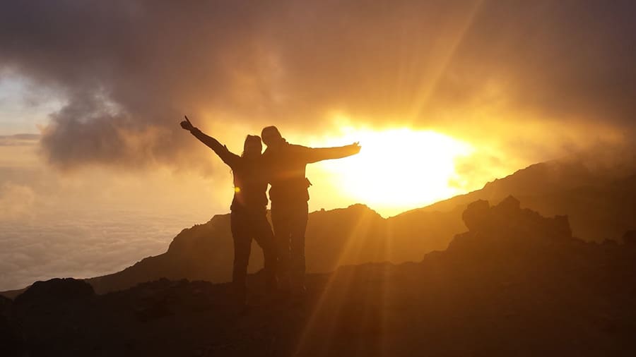 Six hours is a long time to walk and when you have only covered about five kilometres it is also a very slow walk but the final steps to Stella Point with day breaking over our shoulders made it all fade away in an instant. At over 5,600m this is not quite the summit but we had broken the back of it, we had the hard part behind us and now it was a gently sloping 40minute stroll to the top of Africa. We regrouped here and clinked plastic cups of sugary tea to celebrate our nights’ work and joined in more song with our guides and Canadian Medical Assistant, Vince, who had been busy learning some Swahili verses.